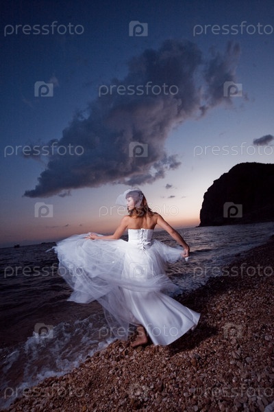 Невеста позирует у моря на закате