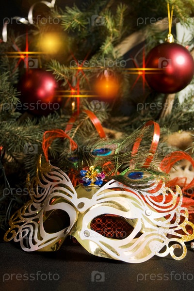 Маска и новогодние гирлянды на черном фоне