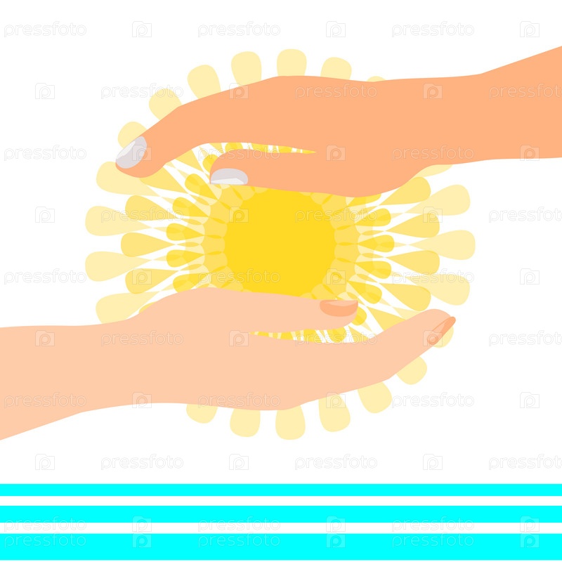 Солнце держится в руках над водой на белом фоне
