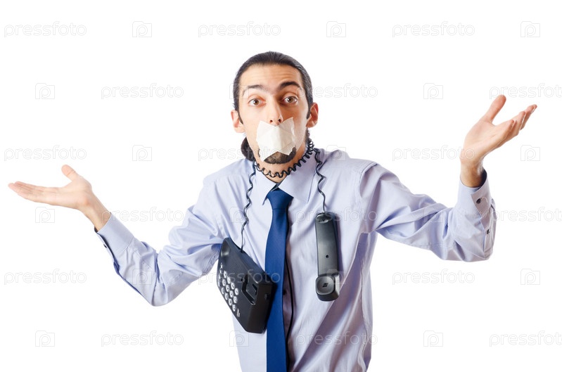 Молодой мужчина с заклеенным ртом не может говорить по телефону