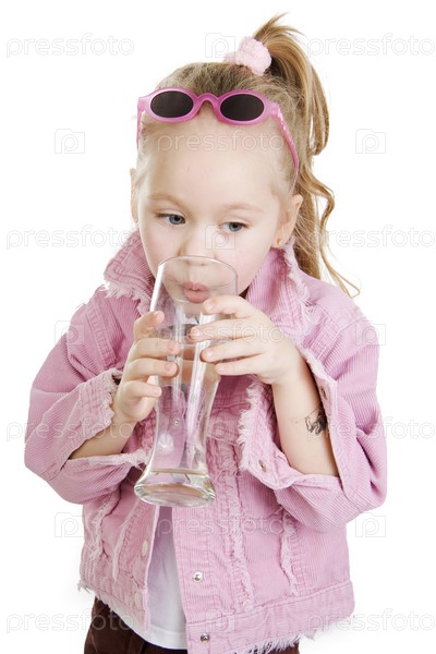 Девочка пьет воду из бокала на белом фоне