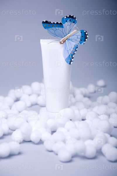 Белый тюбик и голубая бабочка среди мягких белых шариков на светлом фоне