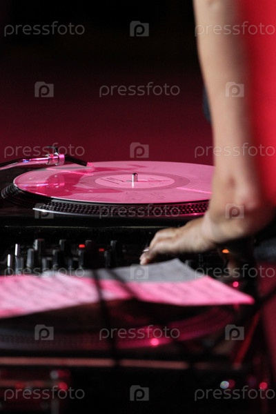 Виниловая пластинка, аппаратура и рука. Красный фон