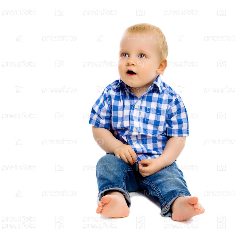 Маленький мальчик в клетчатой рубашке и джинсах