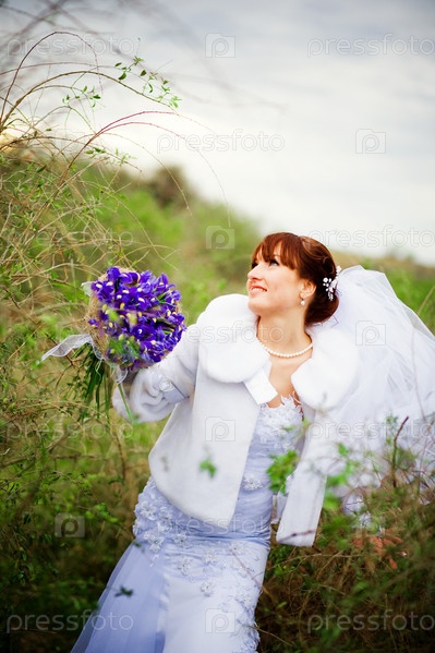 Счастливая невеста стоит у высокого куста
