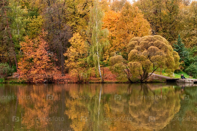 Пруд и пожелтевшие деревья на берегу, осень