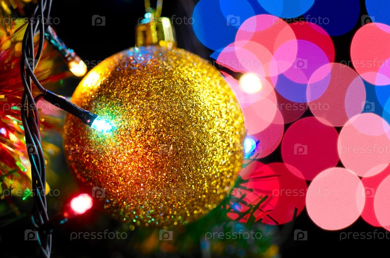 Золотая елочная игрушка крупным планом