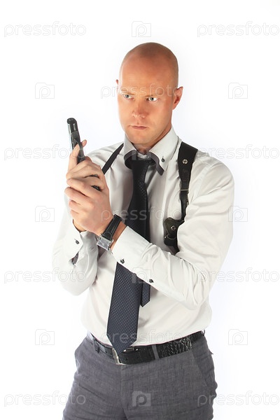 Портрет молодого мужчины с пистолетом в руках на белом фоне