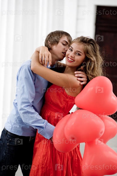 Обнимающаяся молодая пара на фоне высоких белых колонн