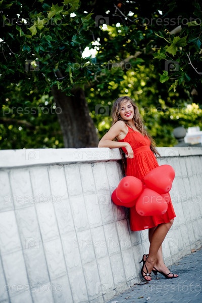 Счастливая молодая женщина с воздушными шарами в парке