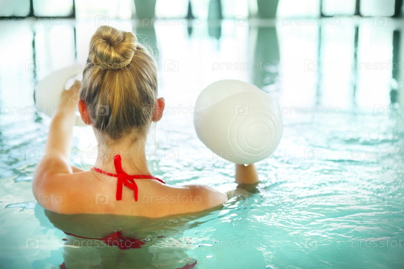 Молодая женщина делает аквааэробику с гантелями в бассейне