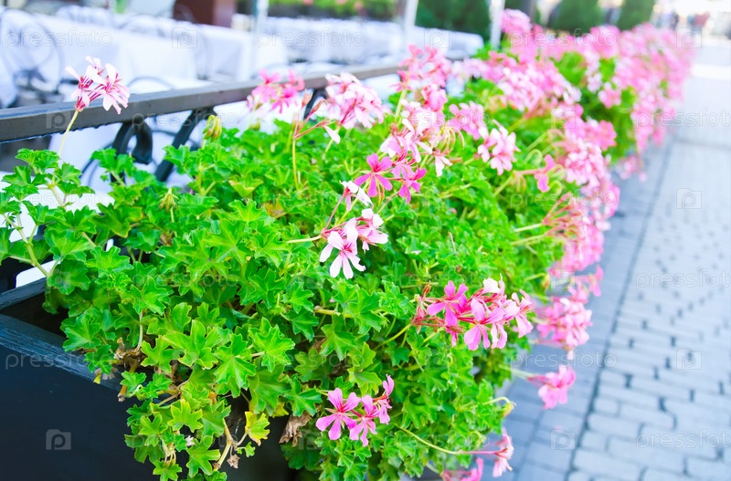 Цветочный горшок с цветами сирени в открытом кафе