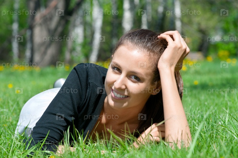 Красивая молодая женщина, лежащая на траве в парке