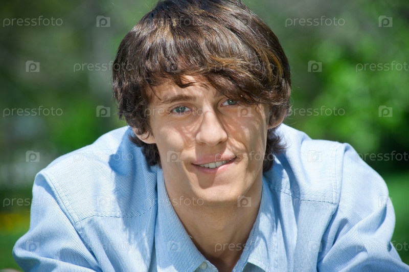 Крупным планом портрет красивого молодого парня на фоне зелени