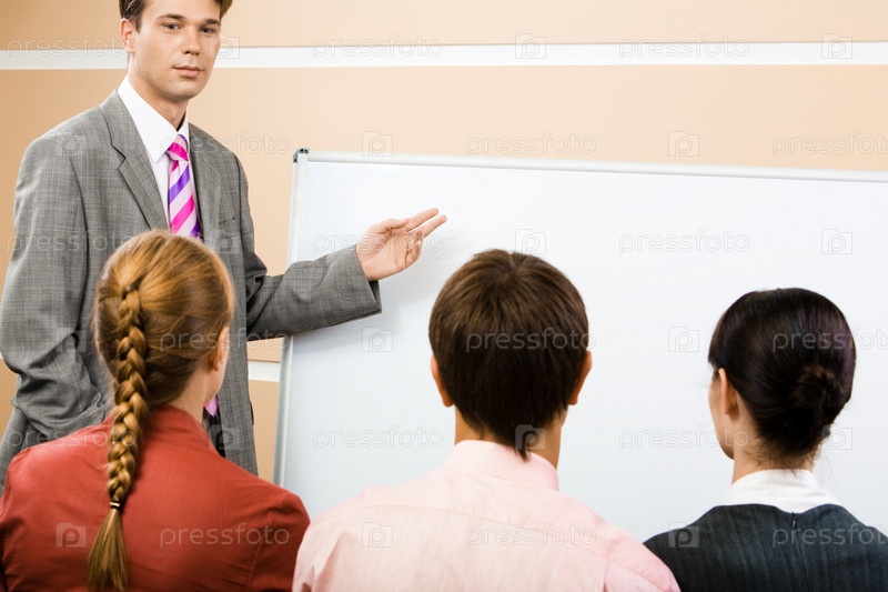 Изображение серьезного бизнесмена, указывающего на доску с тремя партнерами, слушающими его