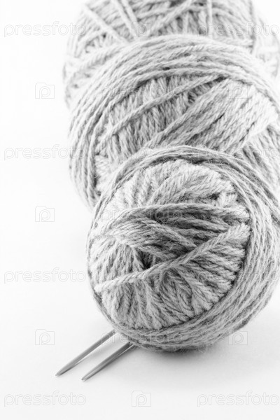 Клубки серой пряжи и спицы крупным планом
