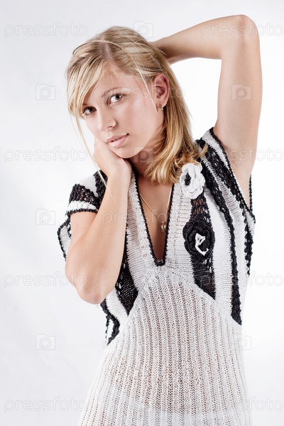 Блондинка в модном трикотажном платье в студии на белом фоне