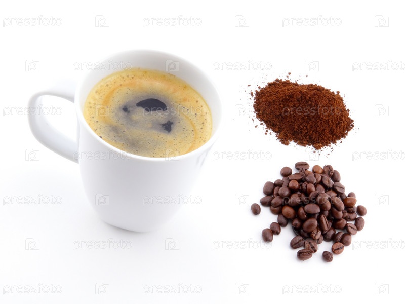 Чашка кофе, молотый и зерновой кофе на белом фоне