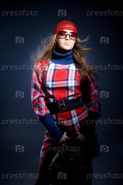 Фотомодель в клетчатом красном платье, в красной шапке и очках на темно-синем фоне