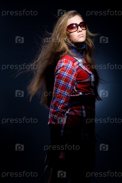 Фотомодель в клетчатом красно-синем платье и очках на темно-синем фоне
