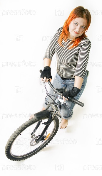 Рыжая девушка на велосипеде, белый фон