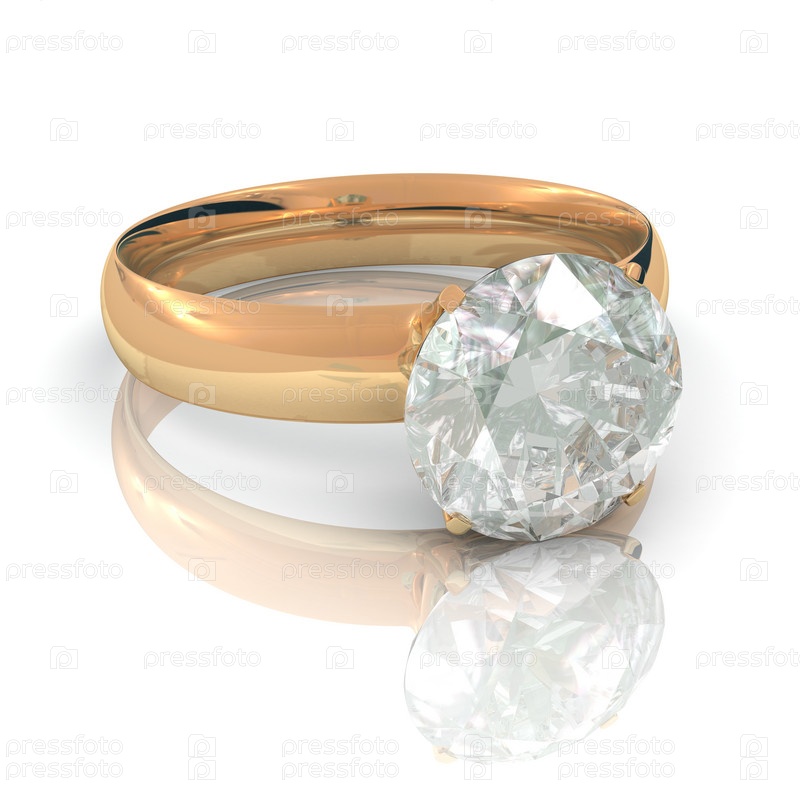 Золотое обручальное кольцо с большим бриллиантом, изолированное на белом фоне