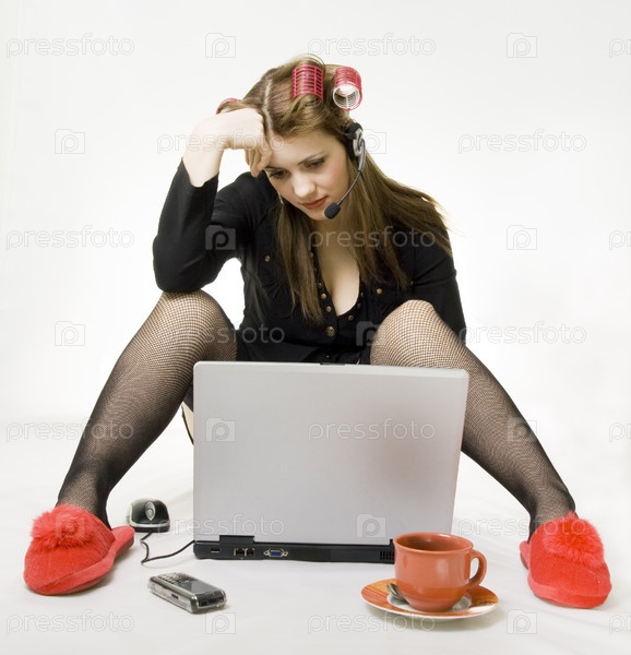 Женщина в бигудях работает за ноутбуком, белый фон
