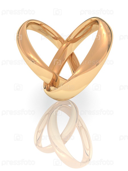 Союз обручальных колец в виде сердца с отражением на белом фоне