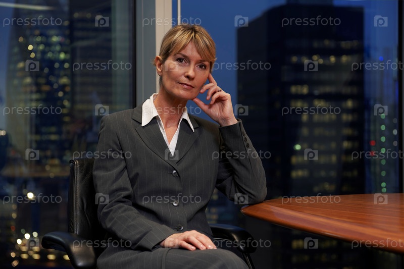 Женщина сидит за столом в зале заседаний, глядя на камеру