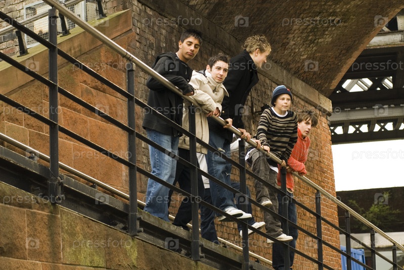 Пяти подростков, стоя возле перил