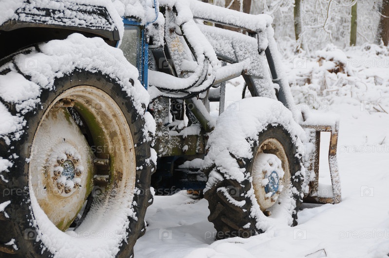 Заснеженный трактор в лесу