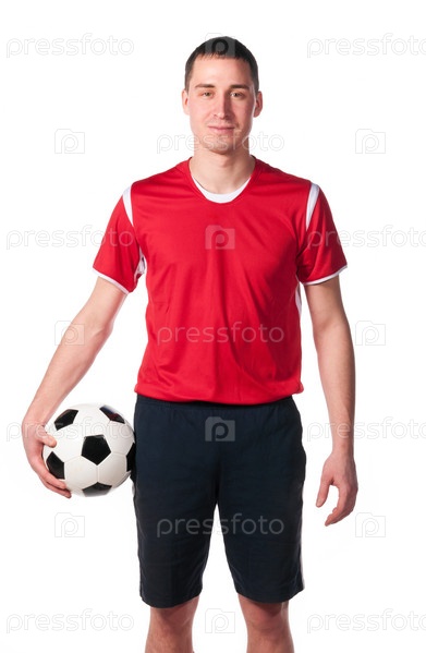 Футболист с мячом на белом фоне