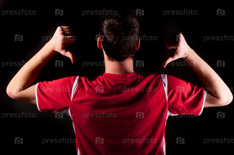 Футболист стоит спиной к камере на черном фоне