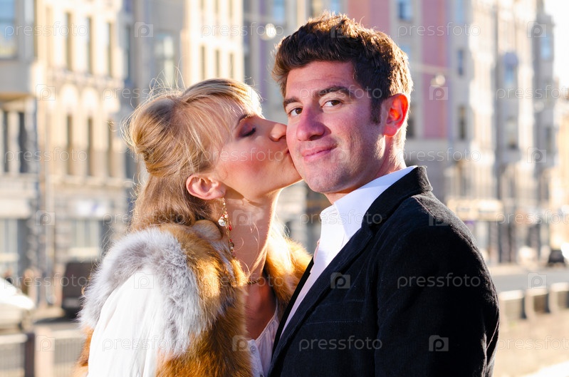 Женщина целует мужчину на улице