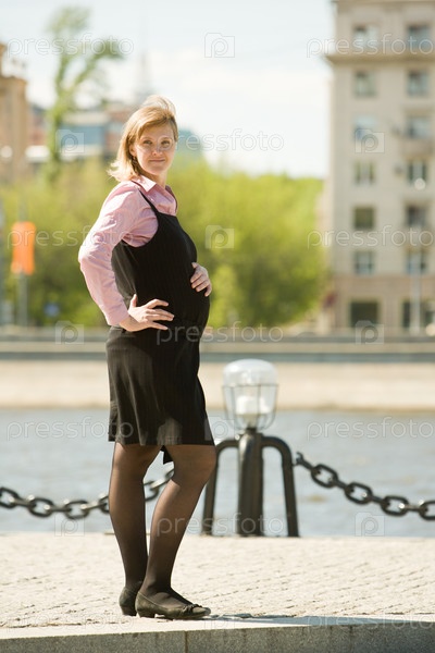 Беременная женщина стоит на набережной