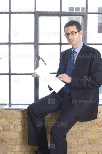Бизнесмен, сидя на подоконнике