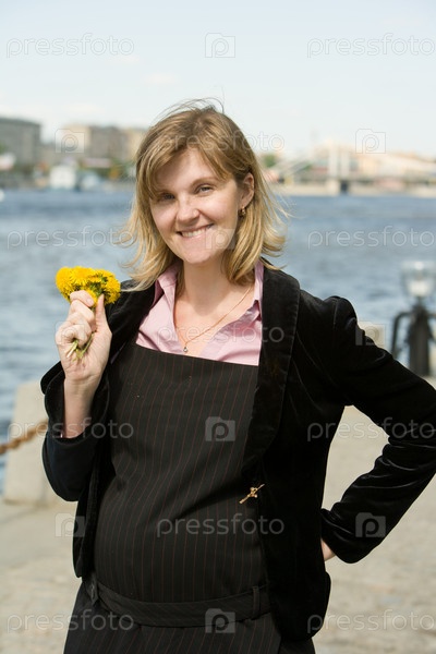 Беременная женщина с букетом одуванчиков стоит на набережной
