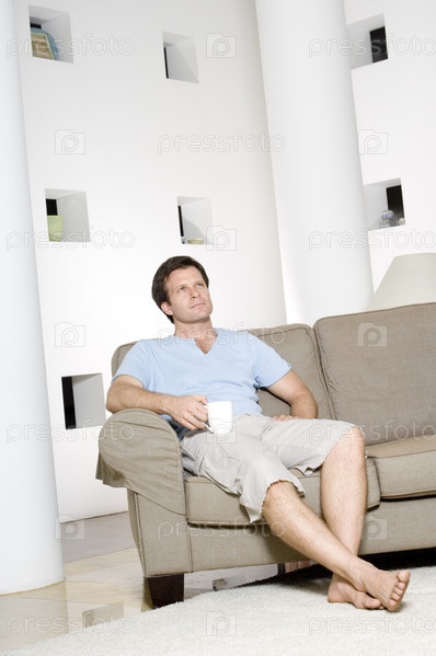 Молодой человек, сидя на диване
