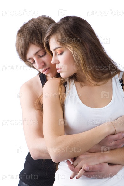 Обнимающаяся молодая пара на белом фоне