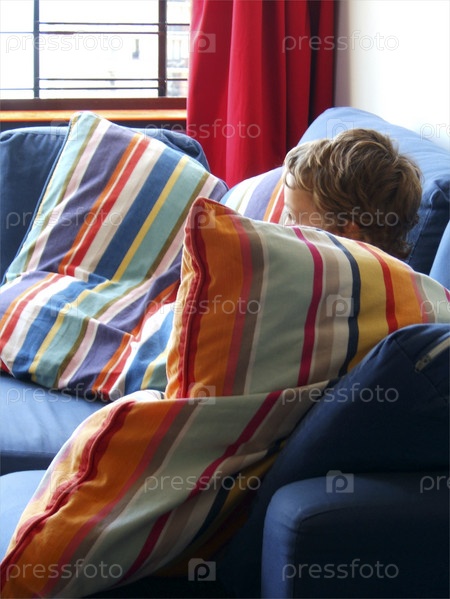 Ребенок сидит за Красочный Полосатый подушку