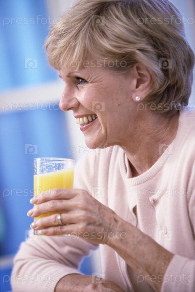 Пожилая женщина держит стакан апельсинового сока