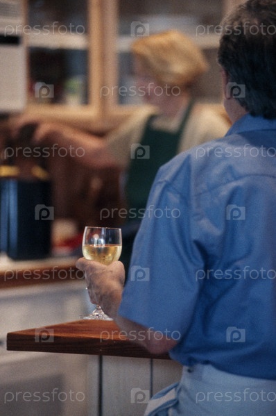 Вид сзади человека, пить вино на кухне с женой
