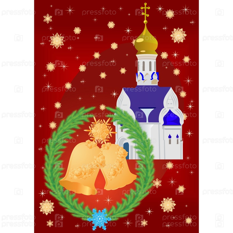 Рождественская открытка с церковью и колокольчиками