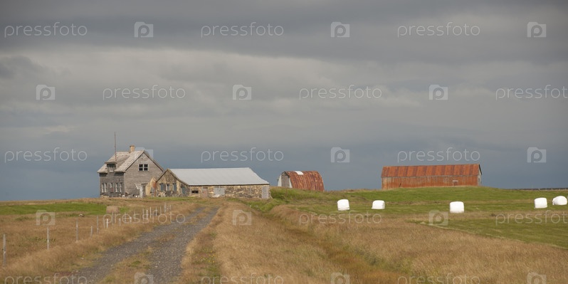 Заброшенные сельскохозяйственников с дом, амбары и тюков сена