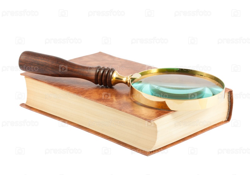 Лупа и книга на белом фоне