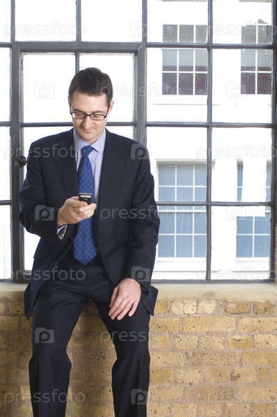 Бизнесмен, сидя на подоконнике и с помощью мобильного телефона