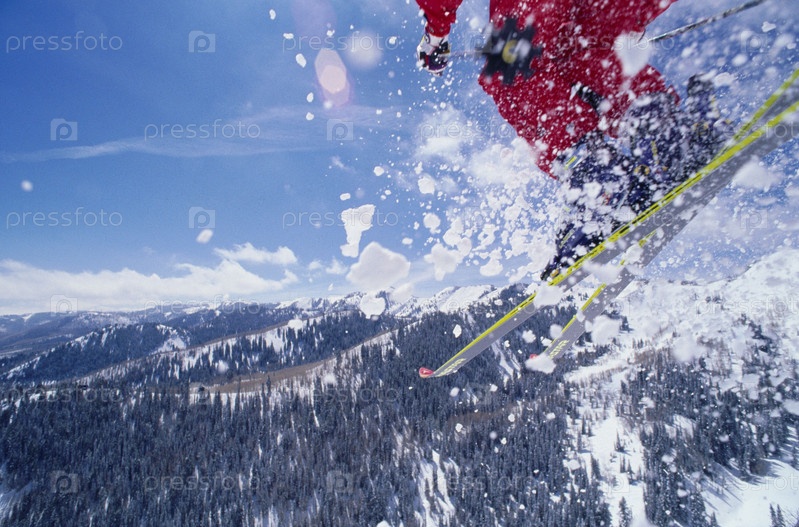 Вид лыжник вырвет снег во время катания на лыжах на горе