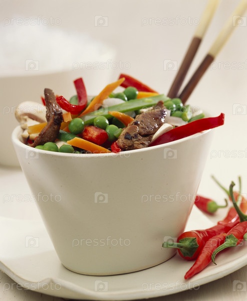 Обжаренные мясо и овощи в блюдо с палочками для еды