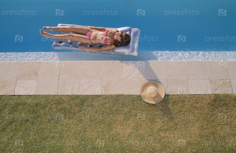 Молодая женщина, лежа на плоту в бассейн