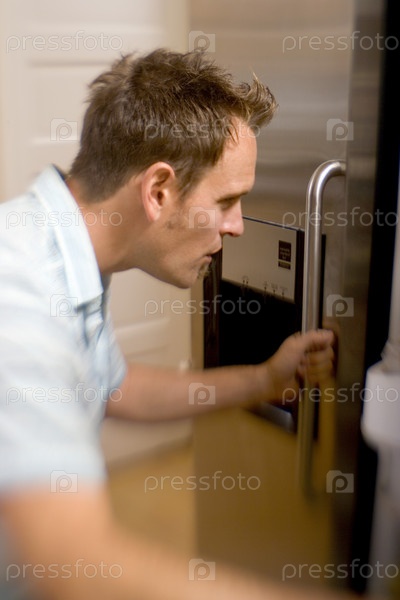 Боковой профиль середины взрослого человека, открывая дверь Холодильник